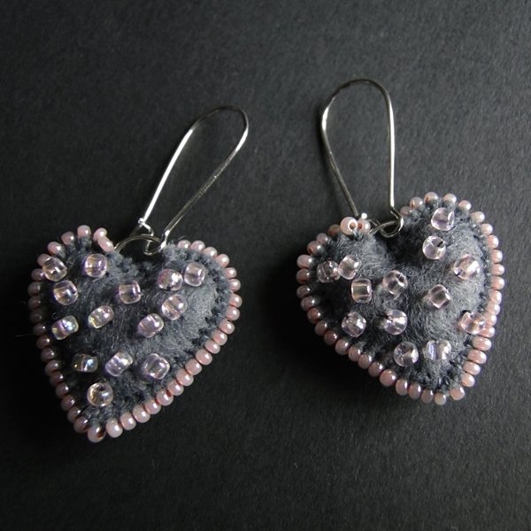 Te cztery pary mi się bardzo spodobały. Zwykle do takich kolczyków dodaje się posrebrzane bigle. Ceny za parę takich kolczyków zaczynają się do 20-30 złotych. Kończą się na kilku setkach, ponieważ głównie zależy to od ilości materiałów oraz ich jakości. Czasami do filcu dodaje się ozdobne koraliki lub kryształy. Jak na przykład te serduszka.